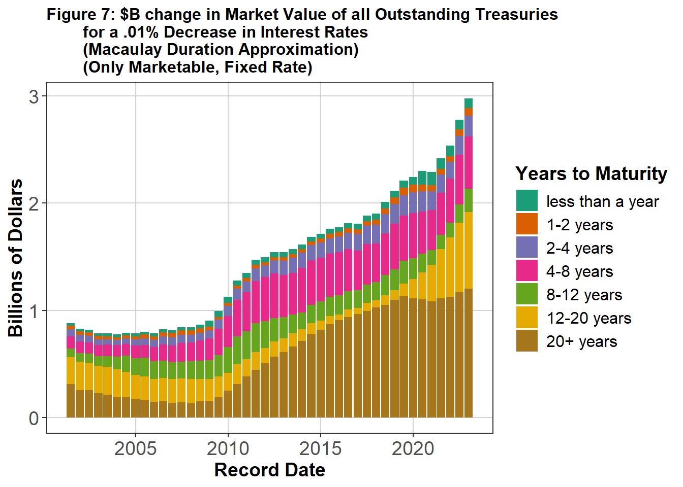 Figure 7 stands in complement to Figure 1, as Figure 7 represents the aggregate duration outstanding of the stock of debt reflected in Figure 1.