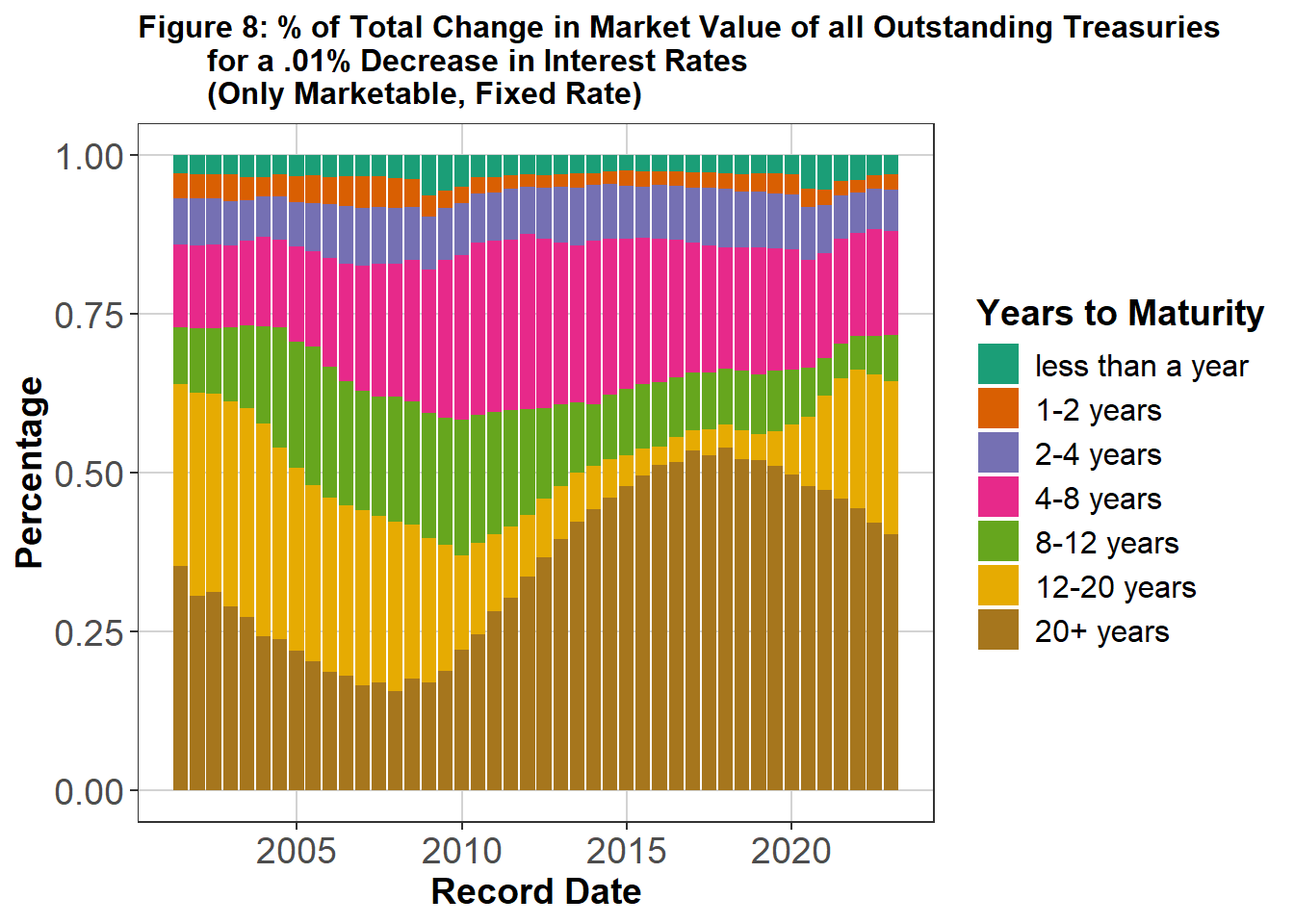 The inspiration for this paper lies in the author’s thirst for measures of the aggregate duration in the treasury market and the evolution of this statistic over time. As discussed in section 2 above, the treasury market is a vital funding mechanism for the U.S. Federal Government, and all of those trillions of dollars of securities hold some measure of interest rate risk that affects the willingness of investors to hold those securities. Figure 7 displays the aggregate duration approximation of the treasury market, colored by years to maturity.