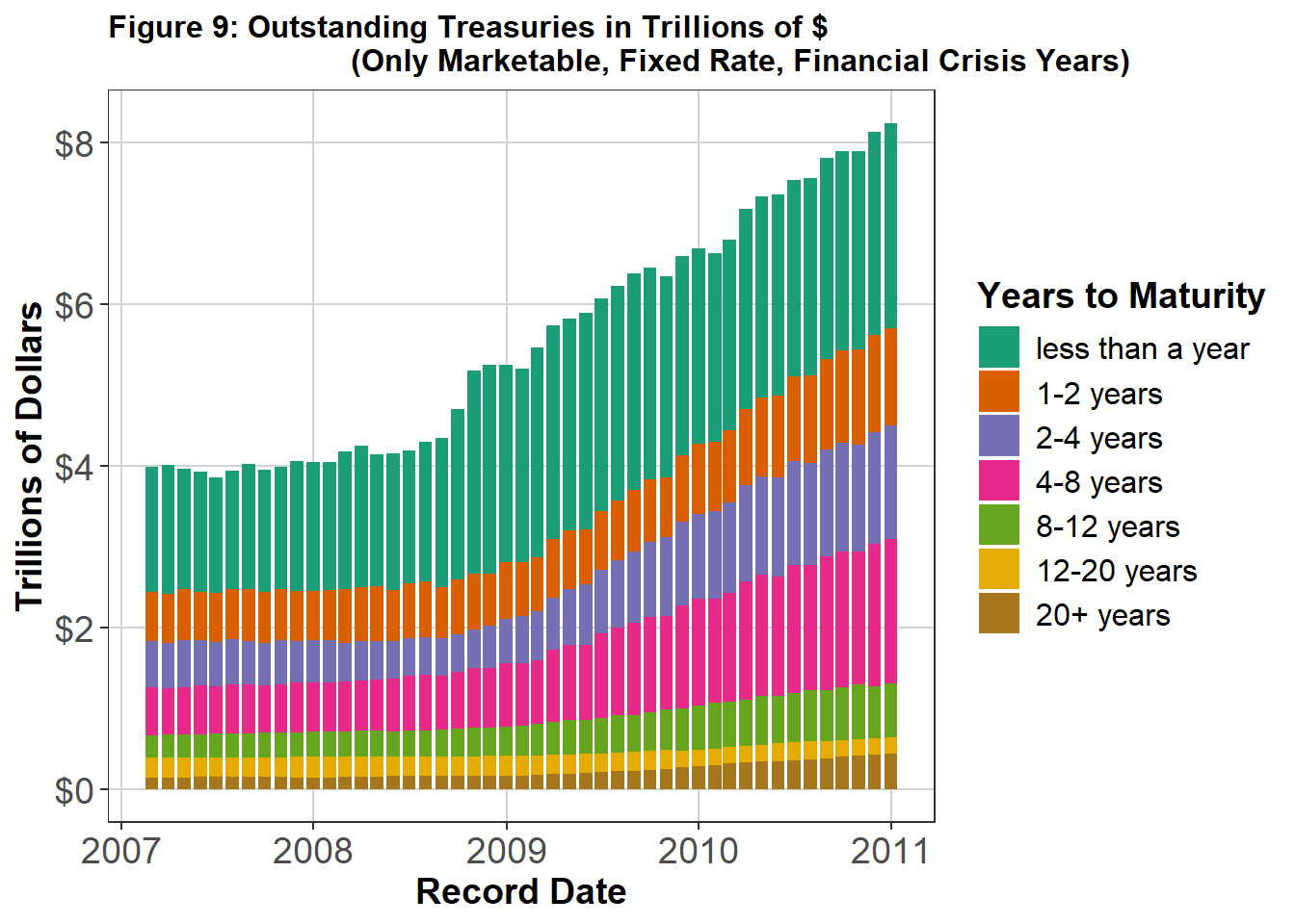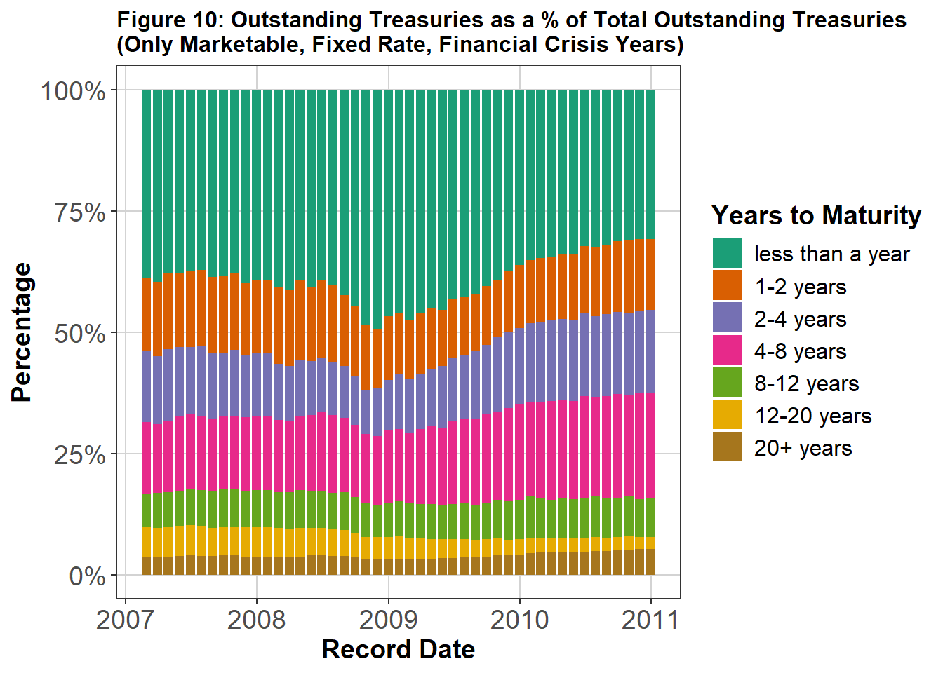 The above Figure 9 displays the debt stock during the most volatile years of the Great Financial Crisis. As the government decided to borrow to stimulate the economy in the second half of 2009, they relied heavily on the issuance of short-duration treasuries, evidenced by the growing proportion of the total debt stock in securities that expire in less than 1 year in Figure 10 below.