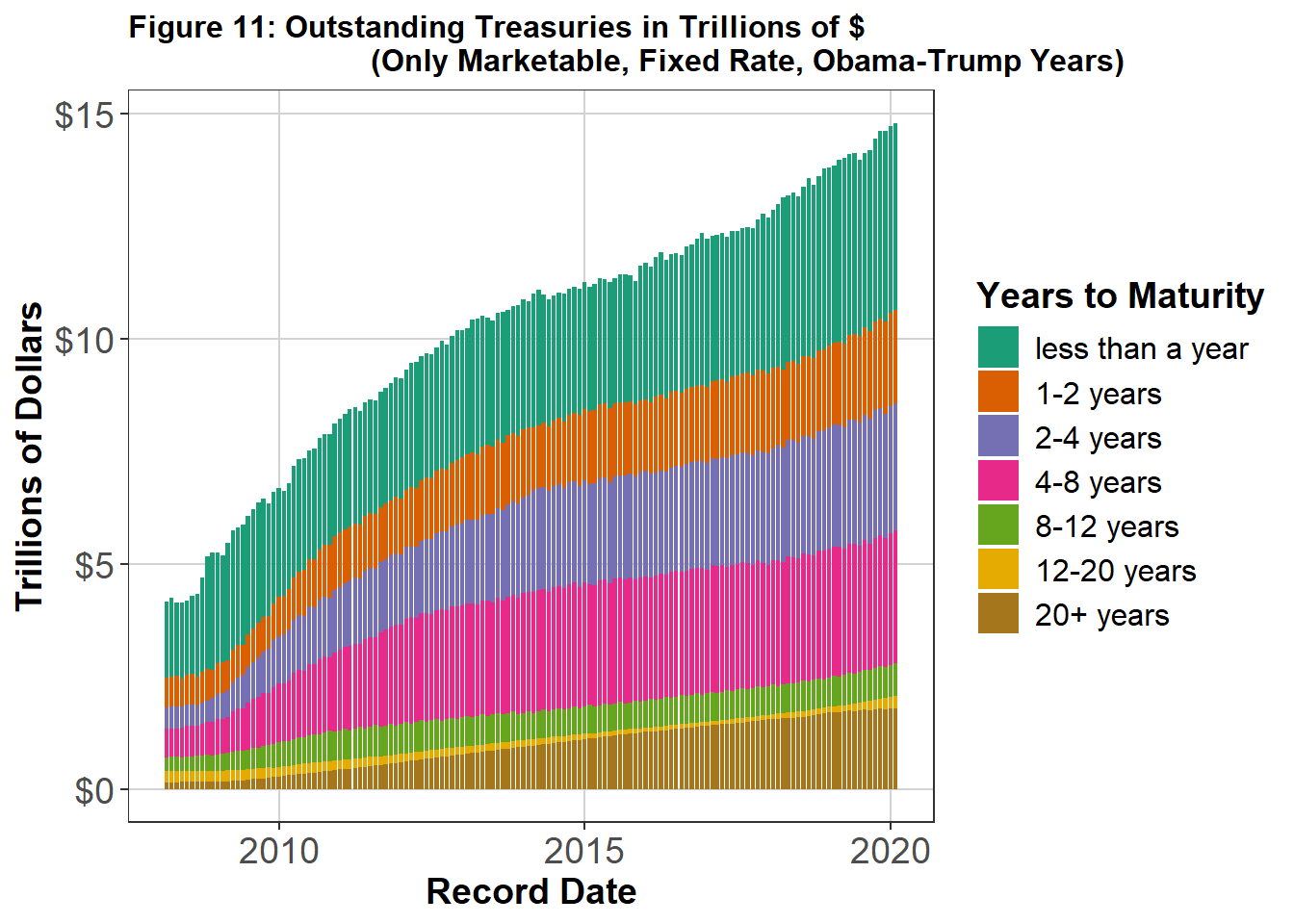 Following the Great Financial Crisis and the passage of Obamacare, the national debt rose considerably faster than before, over doubling between 2010 and 2020. At the same time, the U.S. Federal Government also increased its issuance of 20+ year securities to finance this additional deficit spending. The stocks of these debts are in Figure 11 below.