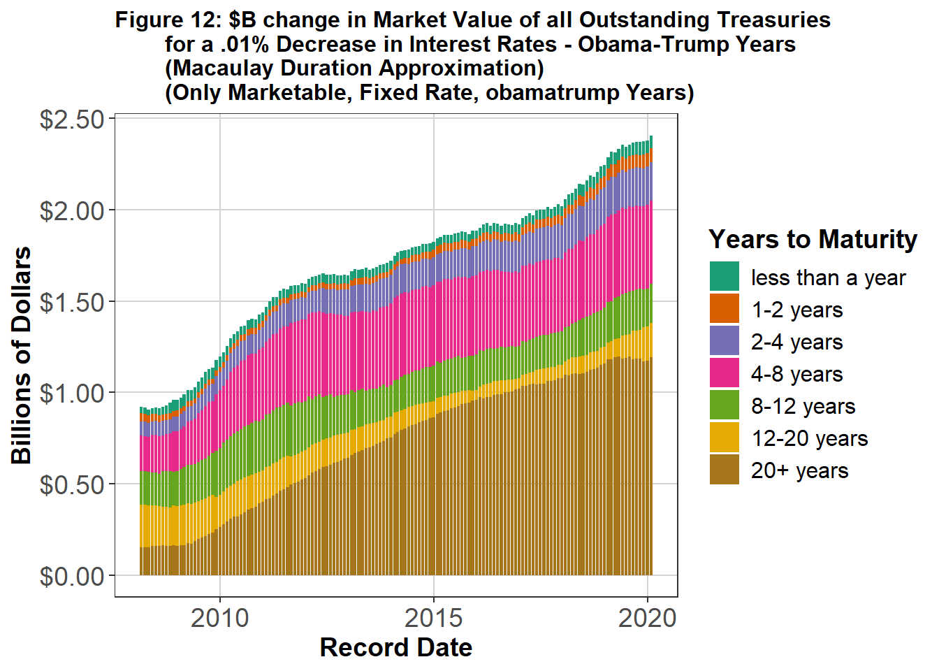 Given what we established above regarding the increased interest rate sensitivity of securities with longer durations, the outsized contribution of securities with 20+ years (and more recently, 12-20 years) to the aggregate duration of the outstanding marketable, fixed rate treasuries is expected, but still jarring in magnitude.