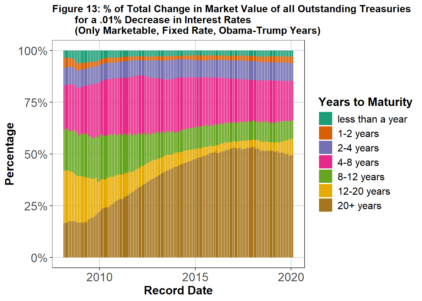 Figure 12 demonstrates that rapid rise in duration outstanding with the issuance of those longer duration securities. Figure 13 displays these as a percentage of total aggregate duration.