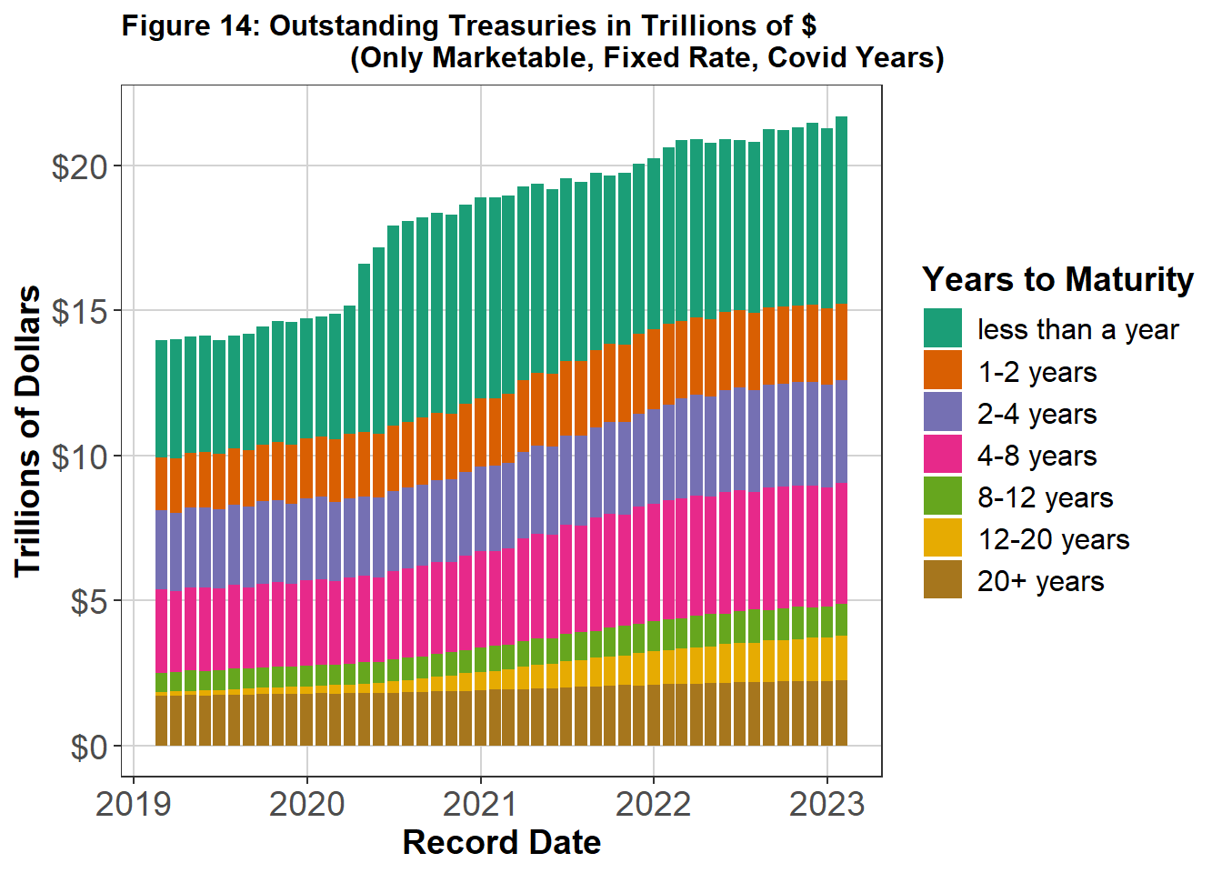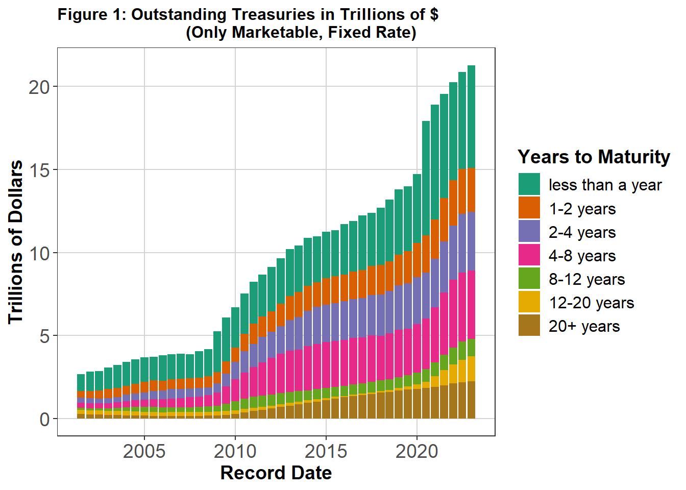 Below, Figure 1 depicts the stocks outstanding of U.S. Treasuries by Years to Maturity with data from the Treasury and Figure 2 depicting aggregate treasury issuance from April 2022 to April 2023.