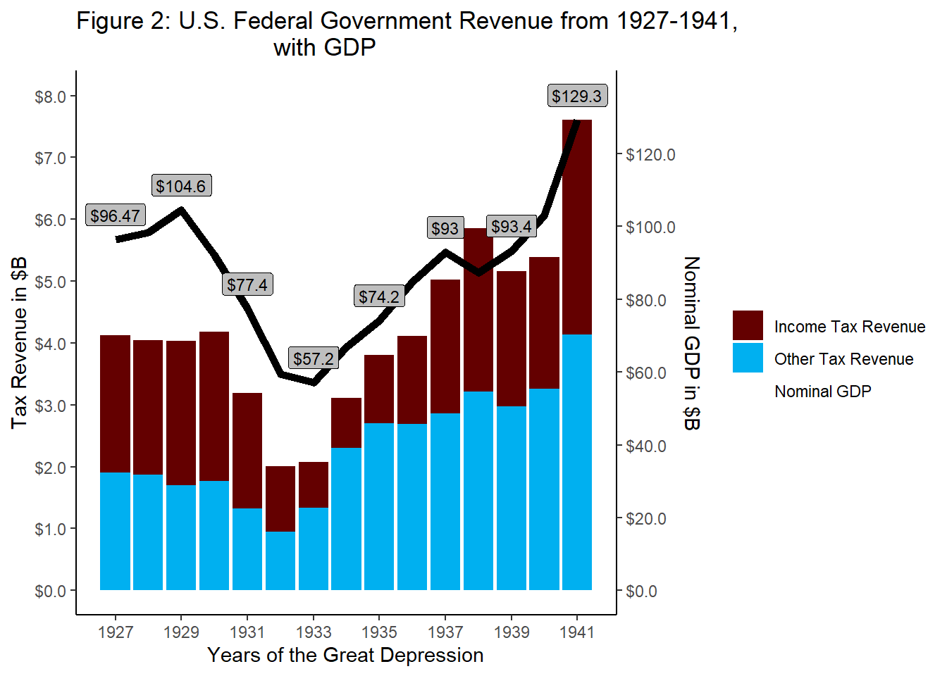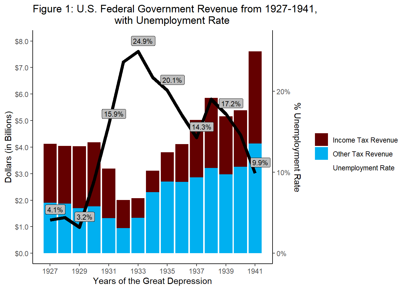 Countercyclical fiscal policy was a cornerstone of the Keynesian revolution in economics. Keynes emphasized that, in economic downturns, governments who imposed austerity and cut spending only worsened their recessions by decreasing the level of aggregate demand. Thus, governments should respond to downturns with stimulus, spending against the cycle. To fund (or pay down the debt from) this stimulus, governments would run a surplus in upturns. The complication in the above policy prescription lies in the nature of the income tax. By the publication of Keynes’ General Theory in 1936, the income tax was a vital funding mechanism for the United States and United Kingdom, among many other countries. Because income taxes are earned by the government only when taxable incomes are earned, income taxes are inherently procyclical. This paper grew out of the author’s attempt to test the strength of the income tax’s cyclicality in U.S. history. The starkest example of the income tax’s cyclicality occurred in the Great Depression. As unemployment increased to as high as 24% in 1933, U.S. income tax revenues fell over 60% (Figure 1). In the years of greatest revenue need, income tax revenues almost disappeared.