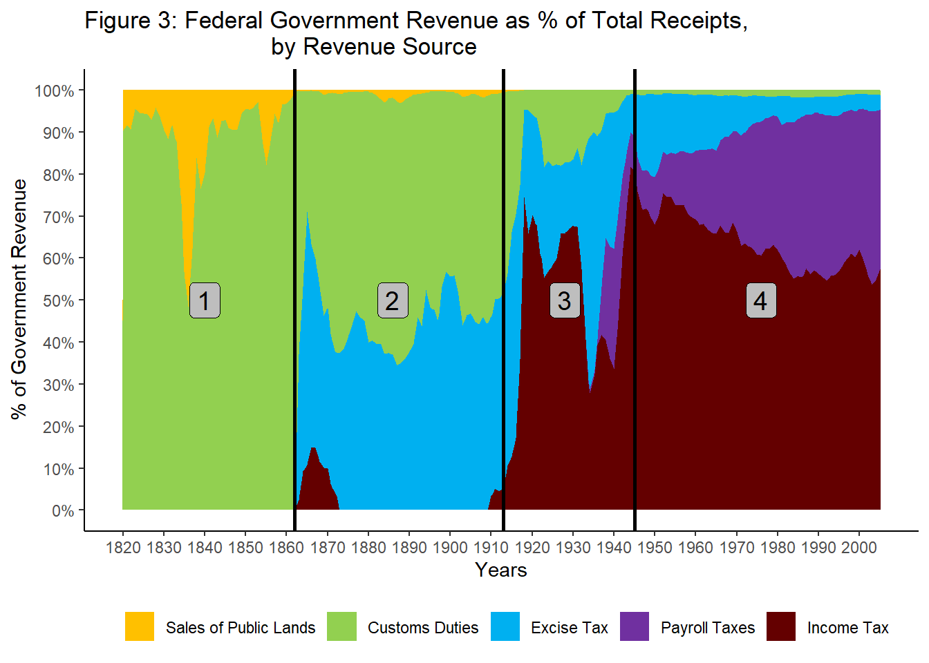 Income Tax Era (1913-1945): After being deemed unconstitutional in 1892, the Income Tax was reestablished in 1913 when Wilson’s administration signed the 16th Amendment into law. The Income Tax does not remain above 50% of federal revenues until World War II. These dates distinguish the third era, in which two wars and a Great Depression occur.