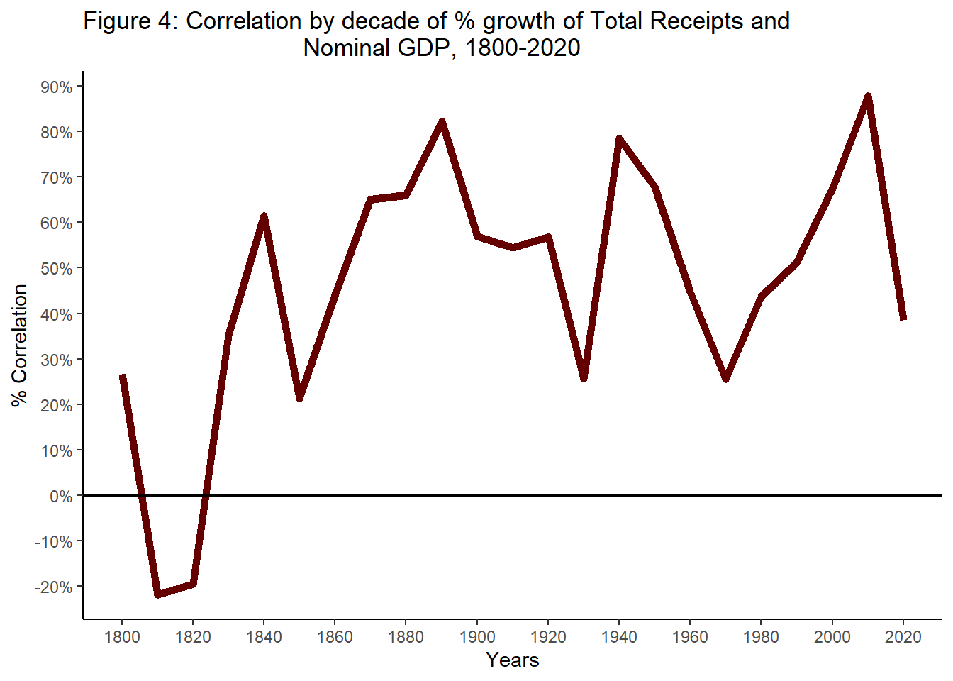 This first Figure 4 provides a two-century overview of the U.S. Federal Government’s Total Receipts’ 10-Year Correlation with Nominal GDP. In the initial 1800-1820, Total Receipts had a negligibly or negatively correlated relationship with Nominal GDP. For the remainder of U.S. history, Total Receipts remains positively correlated with Nominal GDP.