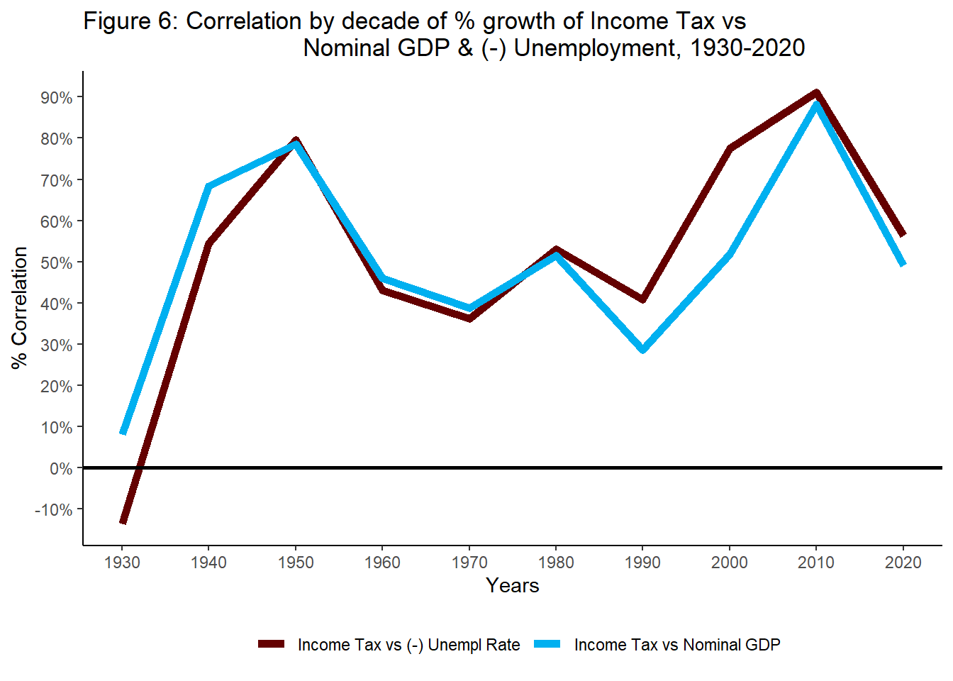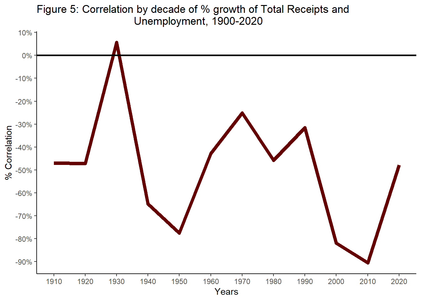 This paper’s method relies on a simple decade by decade calculation of correlation between the measure of cyclicality (GDP or Unemployment Rate) and Tax Revenue by Source.