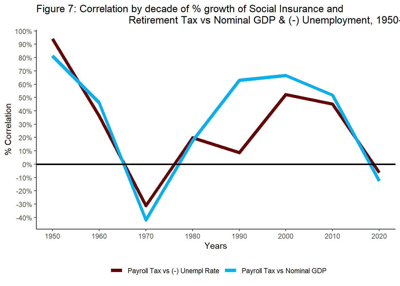 The correlation of Social Insurance and Retirement Taxes with Nominal GDP and the Unemployment Rate tell a different story. When initially created, these Payroll taxes grew in a cyclical manner. However, since the correlation disappeared in the 1960’s and 1970’s, Social Insurance and Retirement Taxes have not been entirely procyclical or countercyclical.