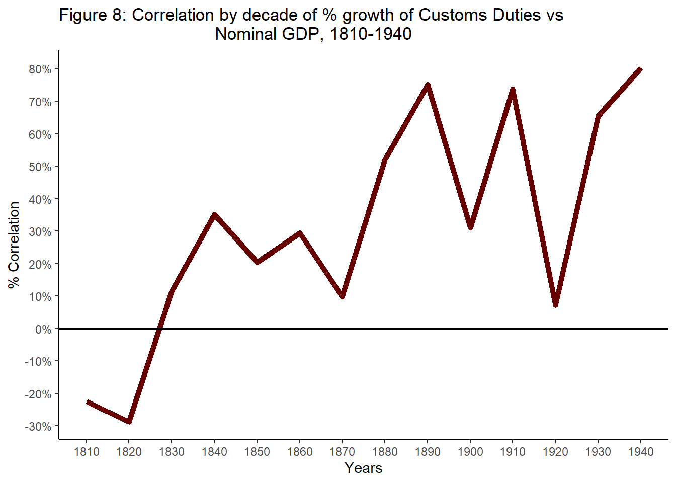 Finally, Customs Duties. Customs Duties are only compared to Nominal GDP because our Unemployment dataset does not reach before 1900. Though the picture is mixed before 1860, after 1880 Customs Duties remain positively correlated with GDP, thus displaying procyclical tendencies, though not as strong as the income tax.